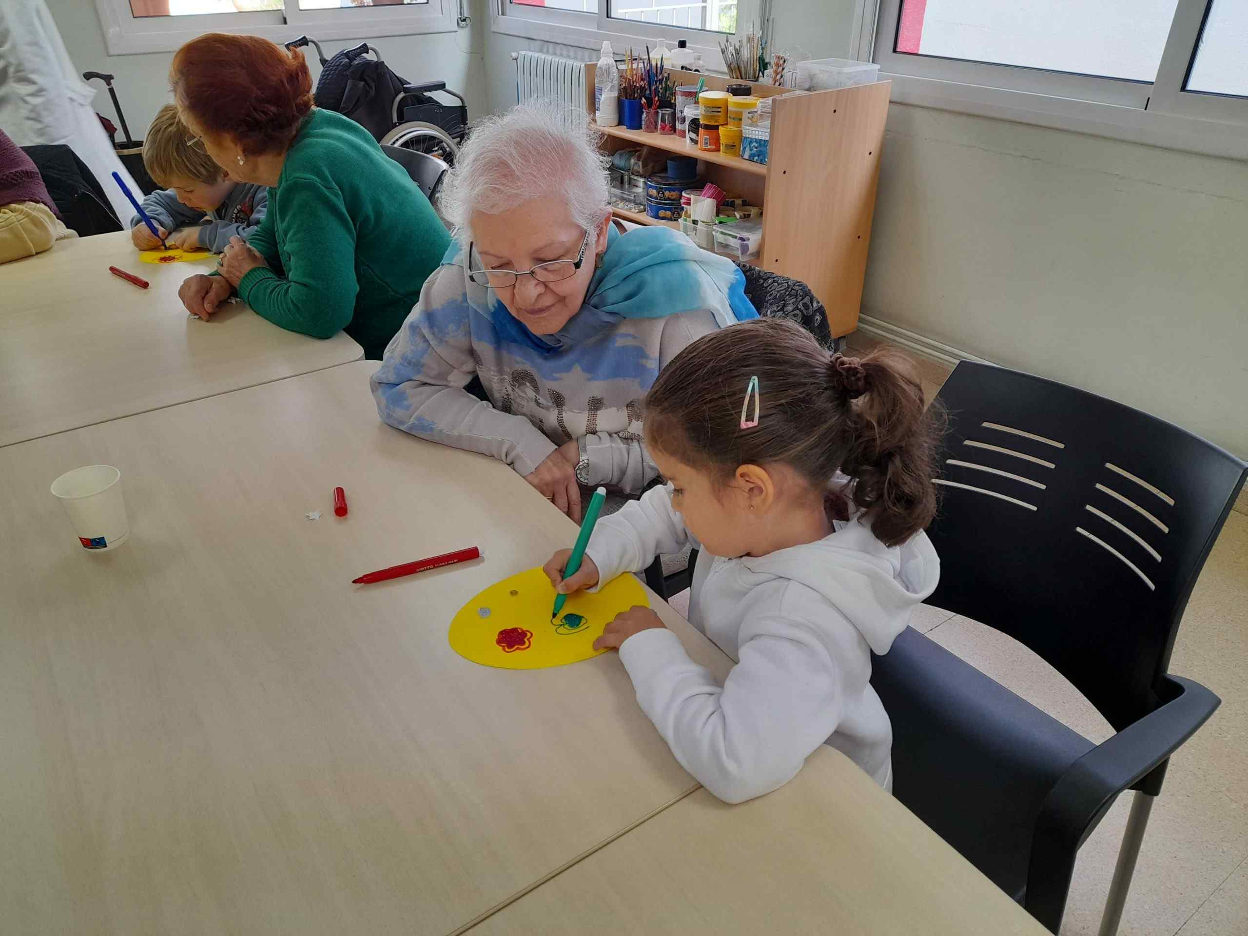 Àvia i nen fent manualitats junts a una taula blanca amb papers grocs i retoladors de colors en un centre cívic