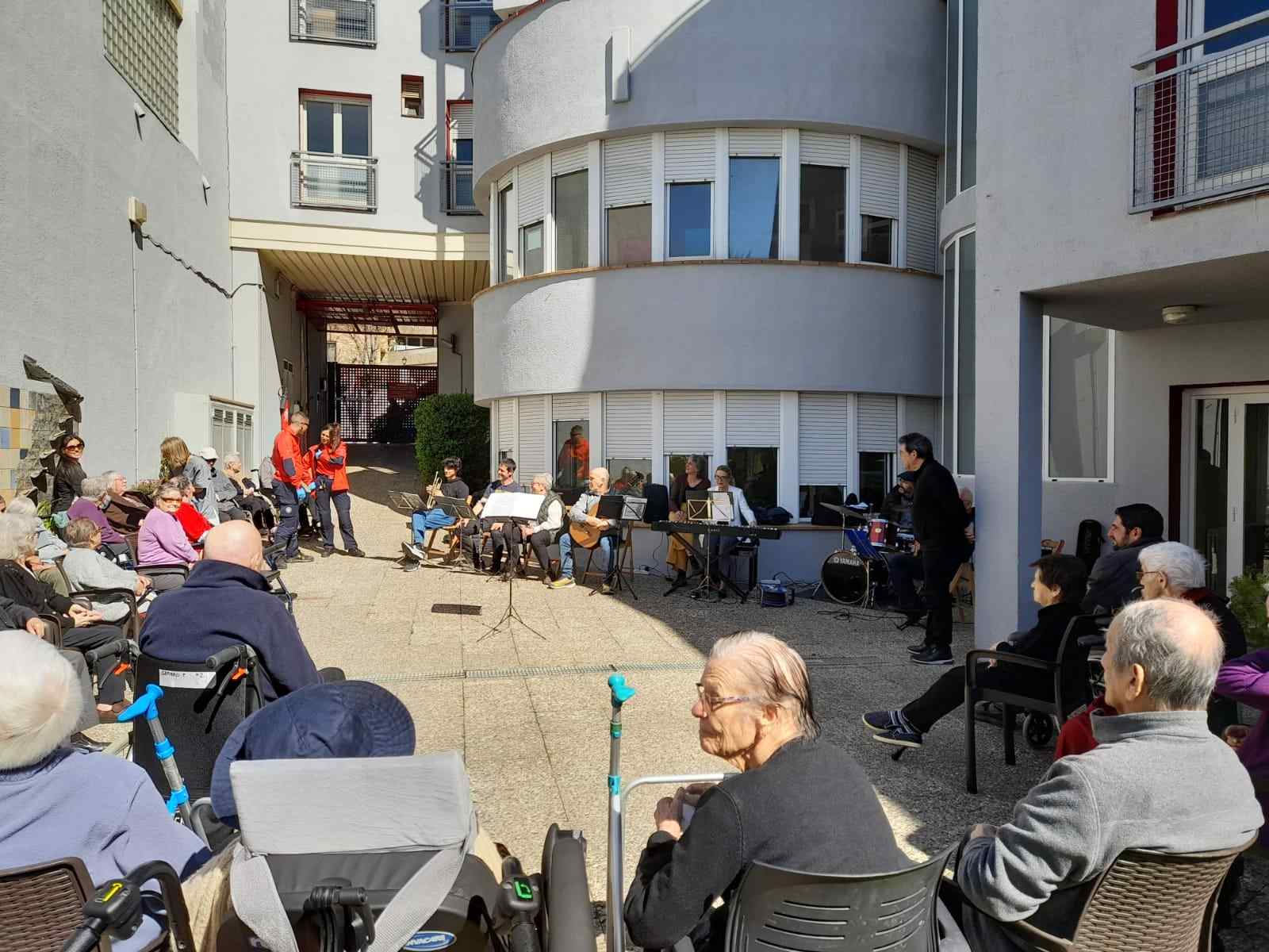 Concert musical en viu al pati d'una residència amb músics i públic assegut gaudint de l'actuació a l'aire lliure